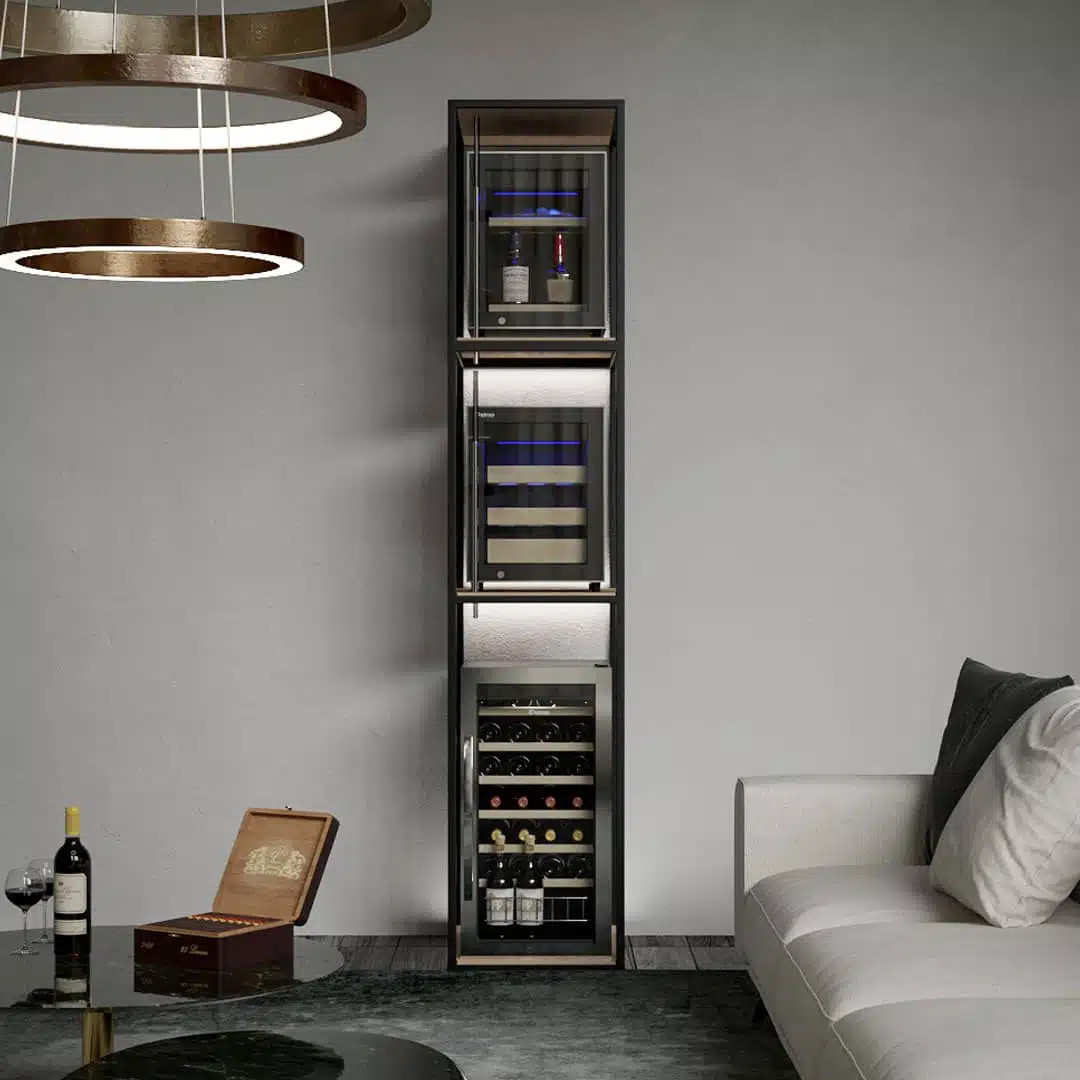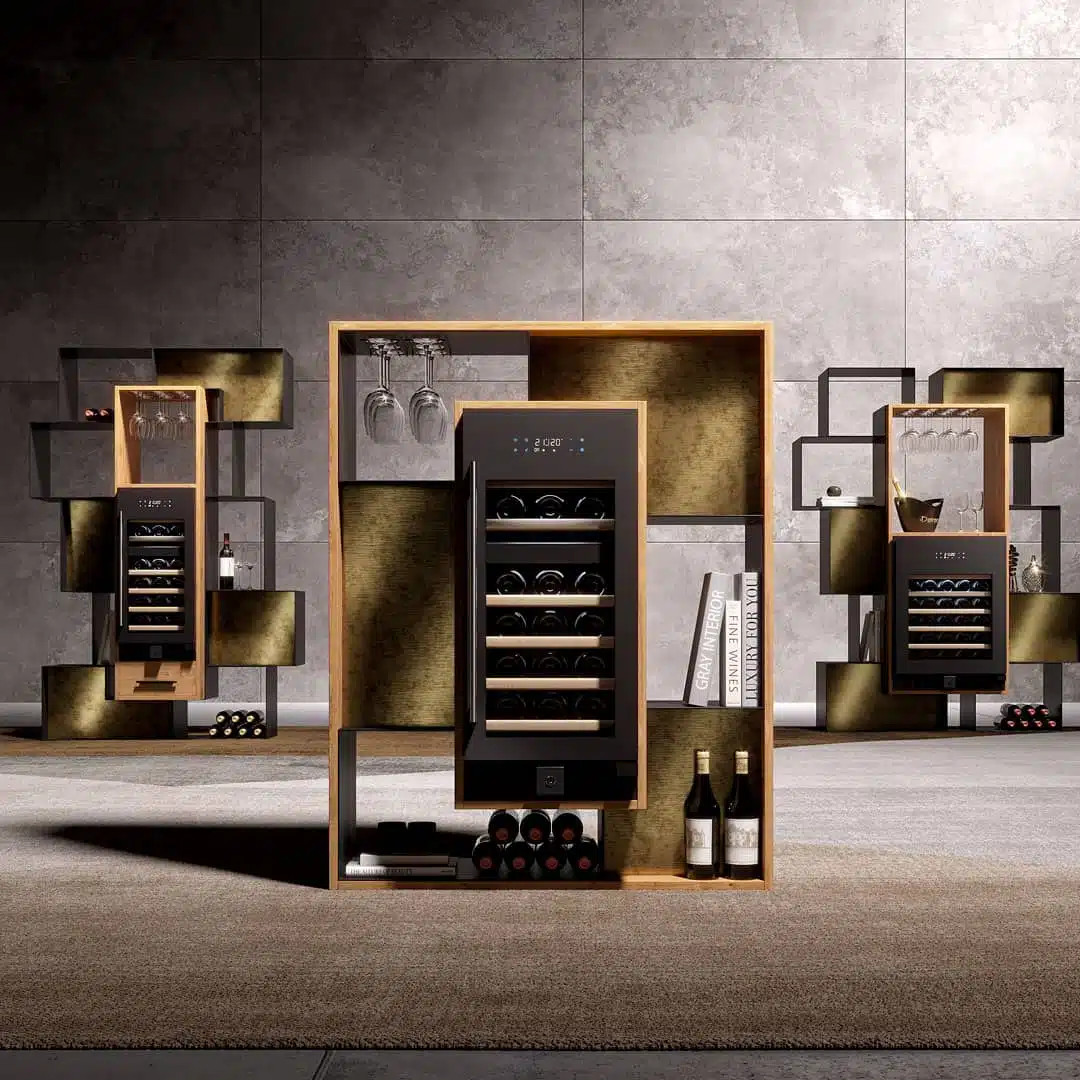 Fémből és fából készültek, melyeket úgy terveztek, hogy optimalizálják a teret, miközben fokozzák a borhűtők esztétikáját.