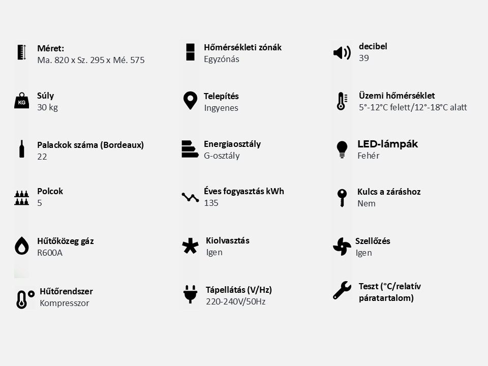 A legújabb generációs technológiával felszerelt, mindössze 39 decibeles zajszinttel a kínálat legcsendesebb borhűtői közé tartozik. A funkciókat a kétrétegű UV-szűrős ajtó és a behelyezett palackokat megvilágító LED-lámpa teszi teljessé.