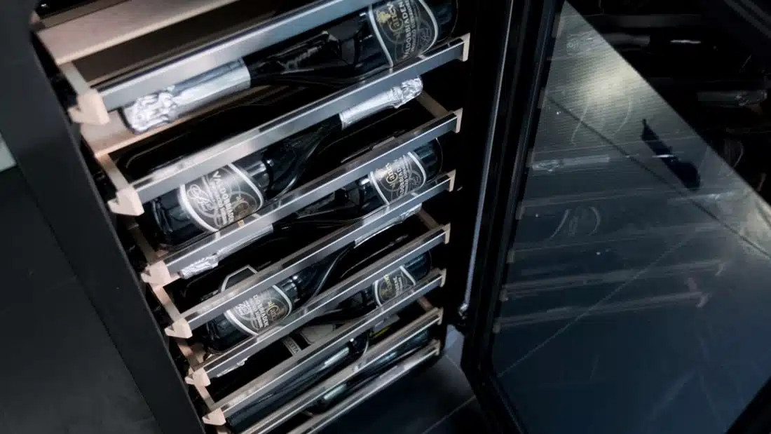 A fa polcok teleszkópos síneken futnak, és fém előlappal rendelkeznek a palackok írásához és katalogizálásához.