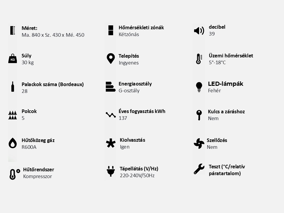 A kompresszoros technológia lehetővé teszi a hőmérséklet 5°C és 18°C közötti beállítását. Mivel statikus, nincs belső szellőzése.