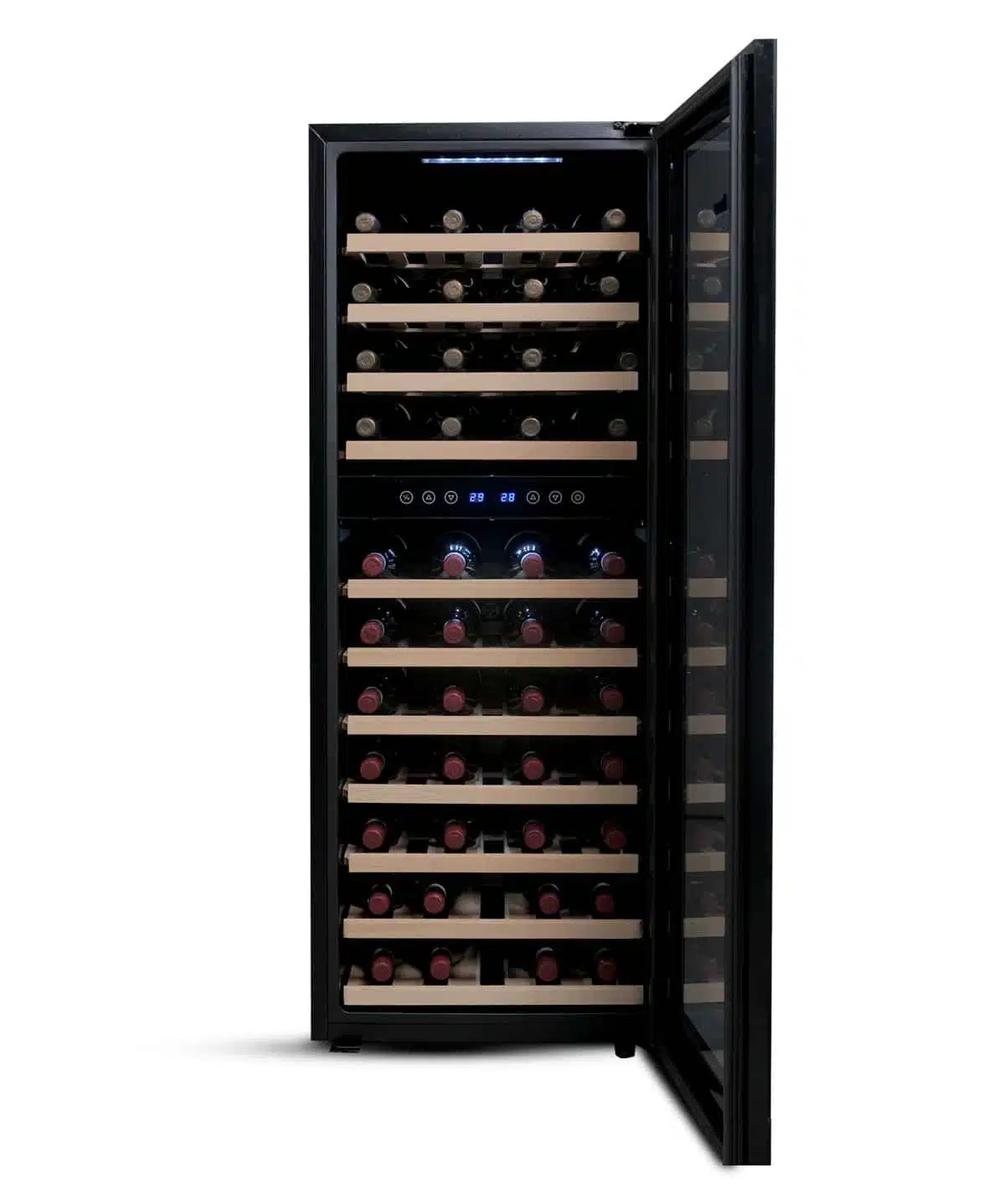 Az értékes és kifinomult bükkfa polcok bármilyen méretű palack befogadására alkalmasak . A borhűtő szíve a központi kijelző, amely lehetővé teszi a hőmérséklet pontos beállítását a két különálló zónában.